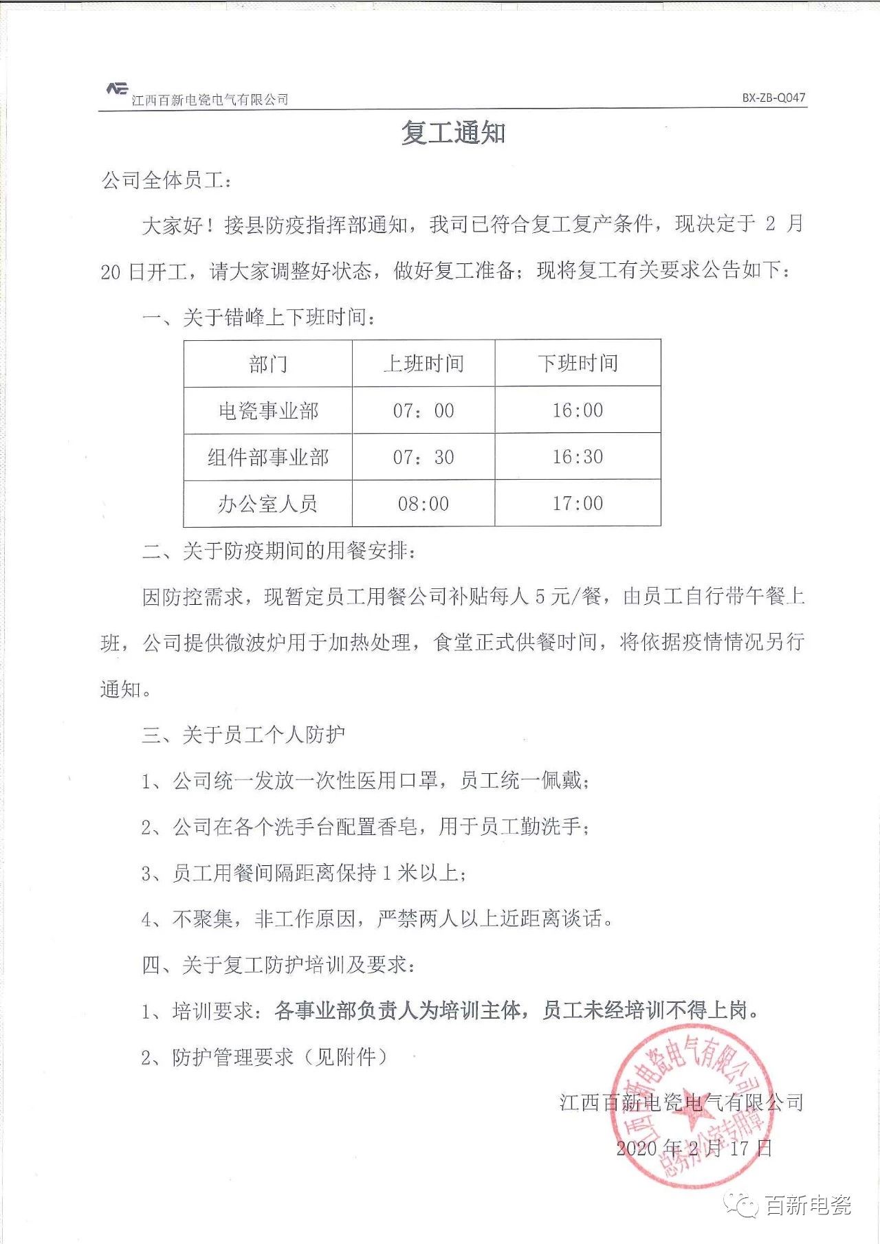 江西百新電瓷電氣有限公司在全面響應蘆溪縣、工業(yè)園區(qū)有關(guān)復工復產(chǎn)的文件通知要求的同時,嚴密做好疫情防控,井然有序的安排復工復產(chǎn)工作,確保疫情防控與復工復產(chǎn)兩不誤。