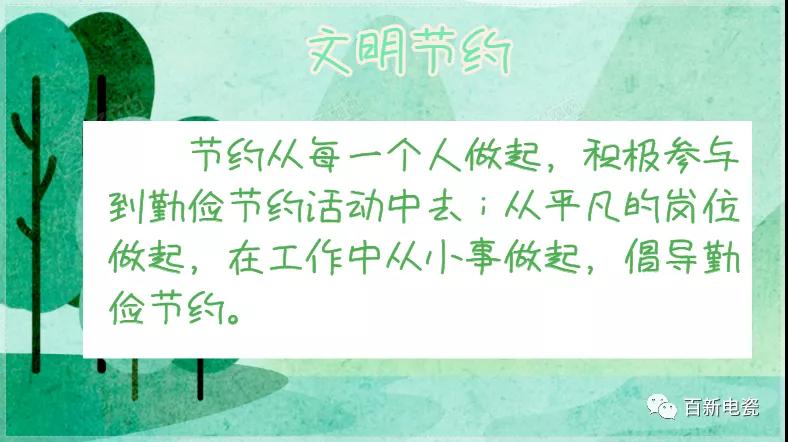 為爭(zhēng)做社會(huì)主義核心價(jià)值觀(guān)的踐行者,共樹(shù)節(jié)儉養(yǎng)德新風(fēng)尚,近期百新黨支部發(fā)出《節(jié)約倡議書(shū)》,呼吁全司深入開(kāi)展文明節(jié)約活動(dòng)。公司各部門(mén)和車(chē)間積極響應(yīng),利用晨夕會(huì)時(shí)間向員工深入進(jìn)行節(jié)儉節(jié)約宣傳教育,并有組織地開(kāi)展多種形式的節(jié)儉節(jié)約實(shí)踐活動(dòng),在全司營(yíng)造厲行節(jié)約、拒絕浪費(fèi)的濃厚氛圍。