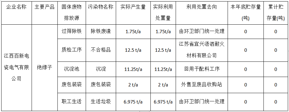 江西百新電瓷電氣有限公司2021年第一季度一般固體廢物信息公開